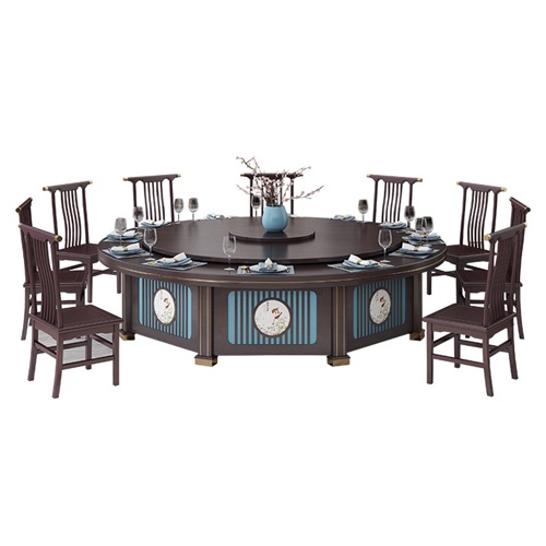 。這款會(huì)所包間新中式實(shí)木電動(dòng)餐桌自動(dòng)轉(zhuǎn)盤(pán)大圓桌是由經(jīng)典的深棕色與藍(lán)色搭配。轉(zhuǎn)盤(pán)和桌面的顏色與圍板的顏色都設(shè)計(jì)為一體色彩,讓電動(dòng)餐桌上下更加呼應(yīng),圍板噴藍(lán)色,承重柱子采用了金色不銹鋼裝飾,簡(jiǎn)潔大方,深受客人們的喜愛(ài)。