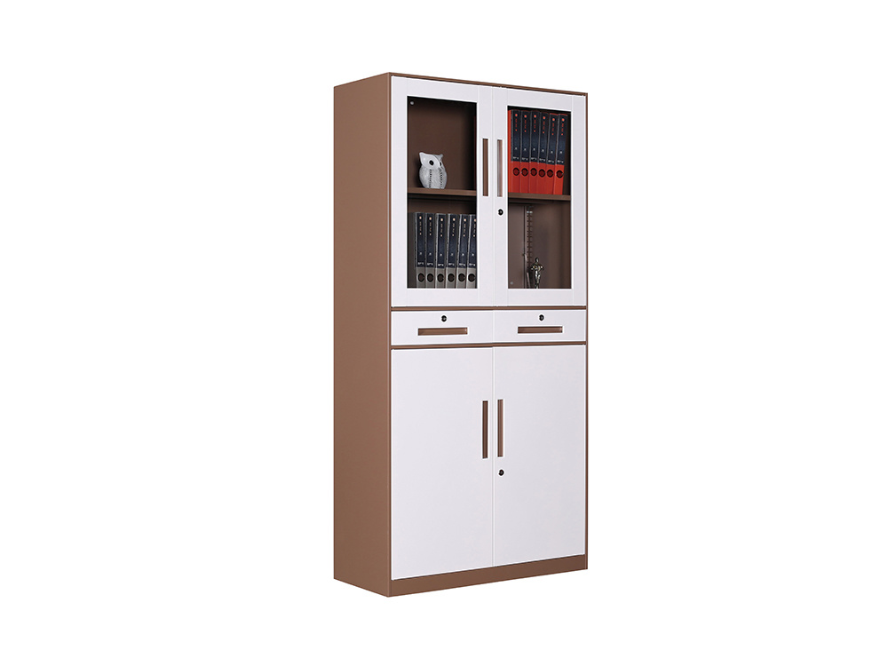 ● 一體結(jié)構(gòu)設(shè)置,上部玻璃對(duì)開門,內(nèi)置1層層板可調(diào)高度,內(nèi)置物品可視,便于拿取,中間2個(gè)抽屜,下部對(duì)開鐵門、門內(nèi)一格板,設(shè)置有拉手和鎖。