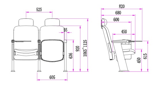 2.座椅基本中心距為525±5mm,座包打開(kāi)側(cè)深680±5mm,寫字板打開(kāi)側(cè)深820±5mm,基本椅高不帶頭枕為920±5mm、帶頭枕為1065~1125±5mm,最小排距:850mm。